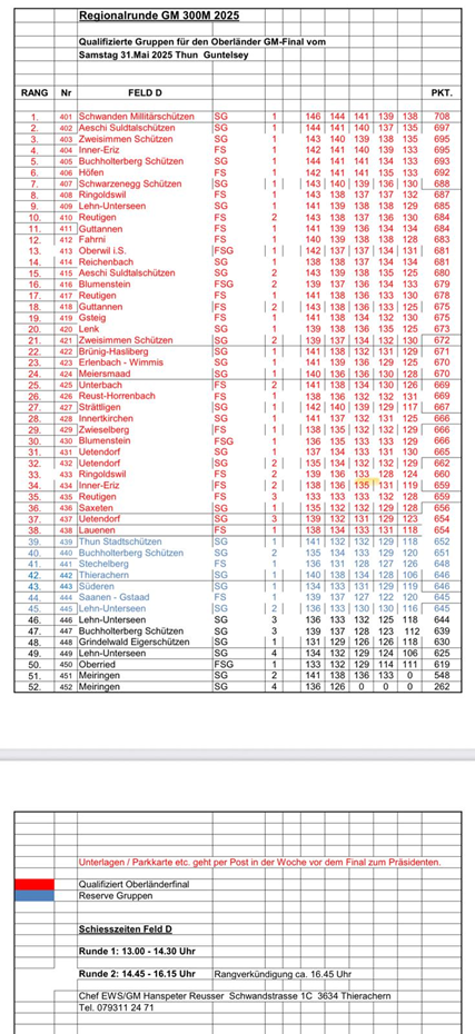Rangliste GM Feld D / 09.08.2025 → Rangliste Strättlig-Cup / 05.07.2025 → Revolverschiessen / 21.06.2025 → Oberländischer GM Final / 31.05.2025 → GM Regionalrunde 300m / 03.05.2025 → Feldschiessen 25m / 25.05.2025 → Feldschiessen 300m / 25.05.2025 → Feldschiessen SG Strättligen / 25.05.2025 → Feldschiessen Sektionsmeister / 25.05.2025 → Burgschiessen 25m / 12.04.2025 → Burgschiessen 300m / 12.04.2025 → Eröffnungsschiessen 25m / 22.03.2025 → Eröffnungsschiessen 300m / 22.03.2025 →